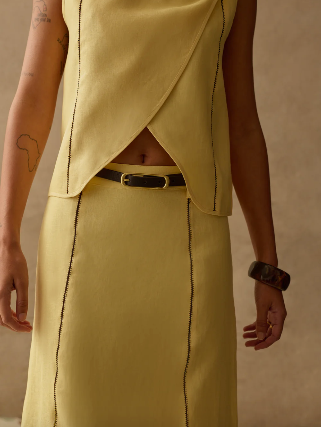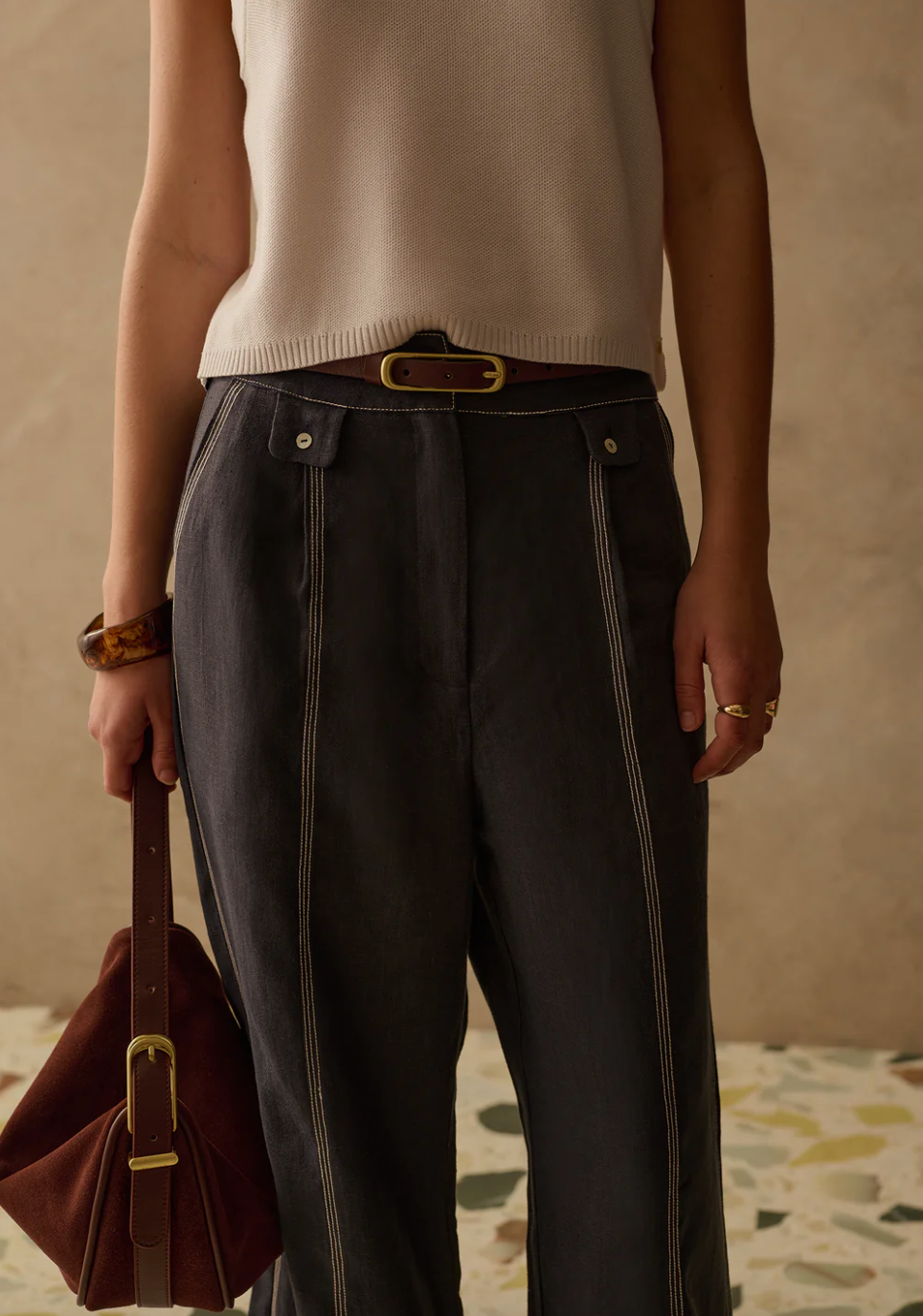 Expertly hand crafted, this elegant wide belt is accented by its custom brushed gold buckle and statement whipstitch. The Viano is designed to effortlessly dress up any casual outfit. Use it to cinch in the waist of your fluid dresses or thread it through the loops of pants or jeans.