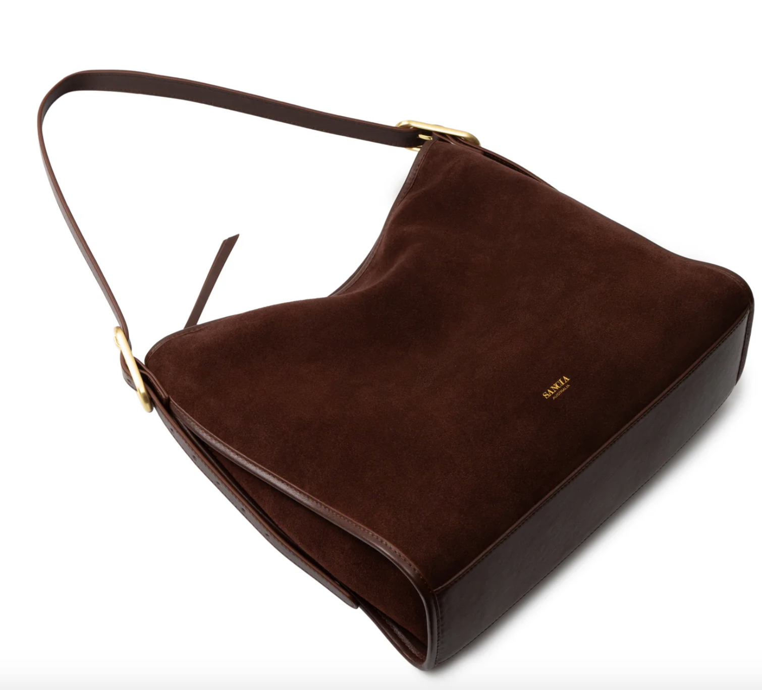 Handcrafted luxury design 100% suede leather Solid Brushed Brass custom SANCIA hardware Supple structure Adjustable shoulder strap Zipper closure 100% linen lining 1 x internal zip pouch compartment 1 X internal pocket compartment 100% Tencel™ SANCIA tote included Delivered in SANCIA gift box with gold foil logo Measurements