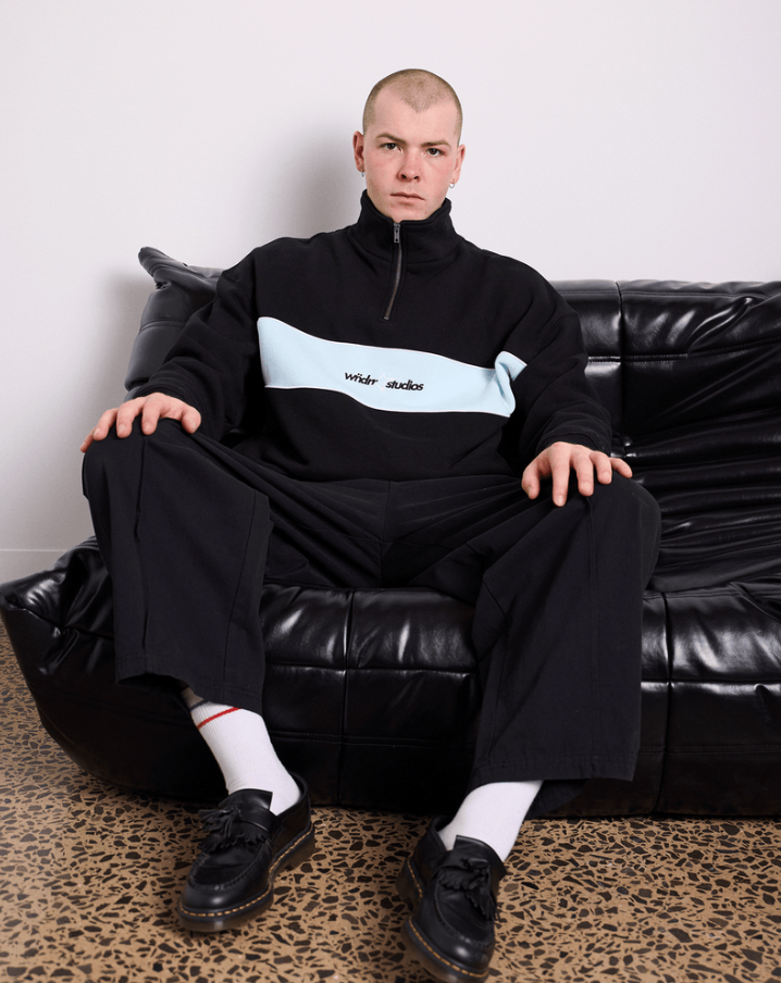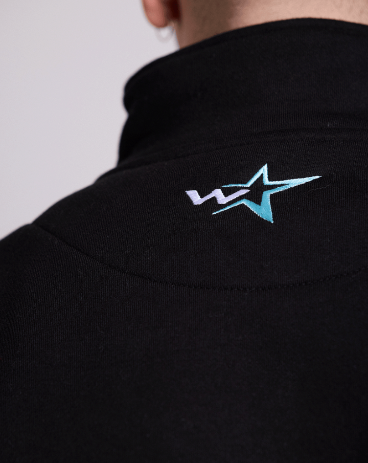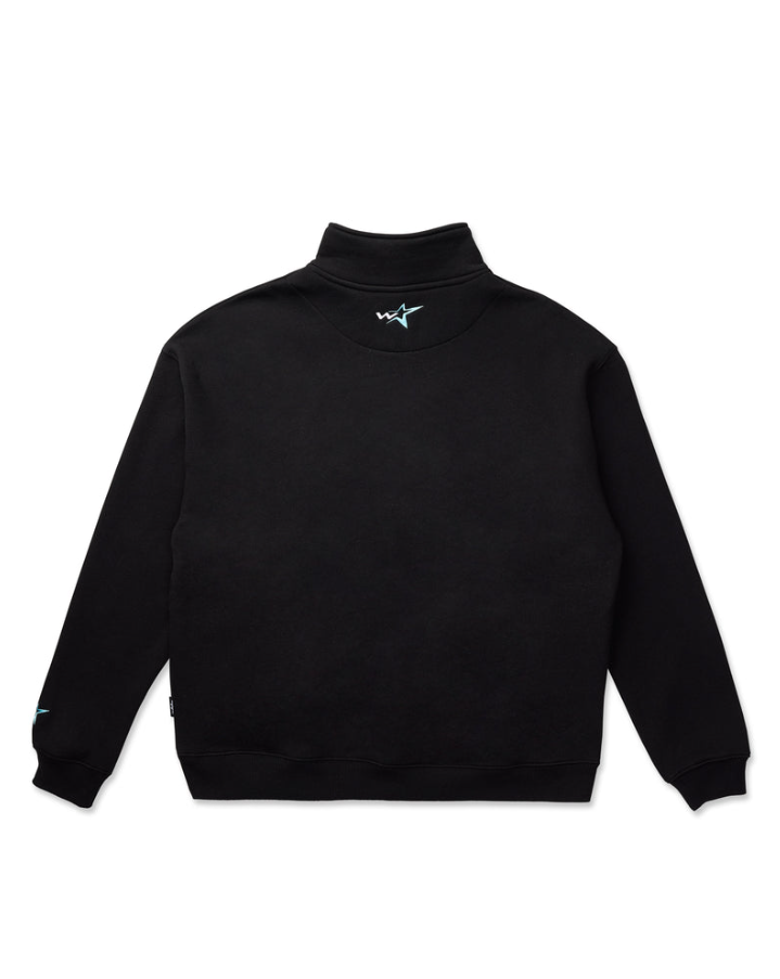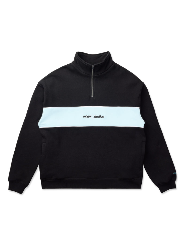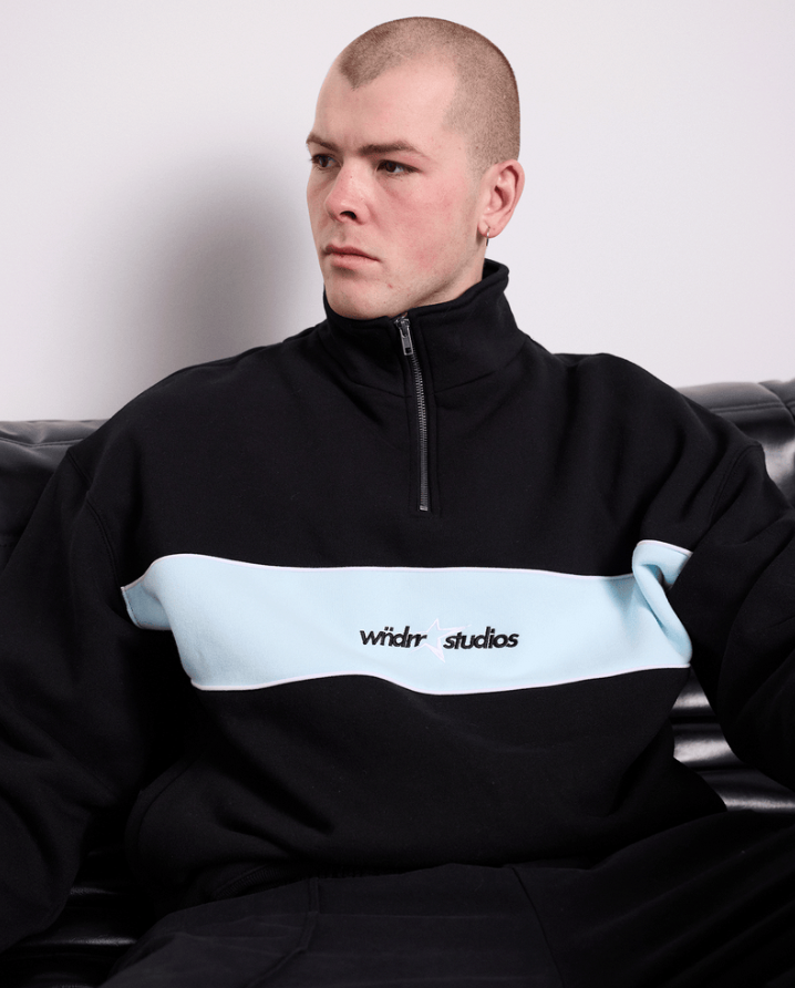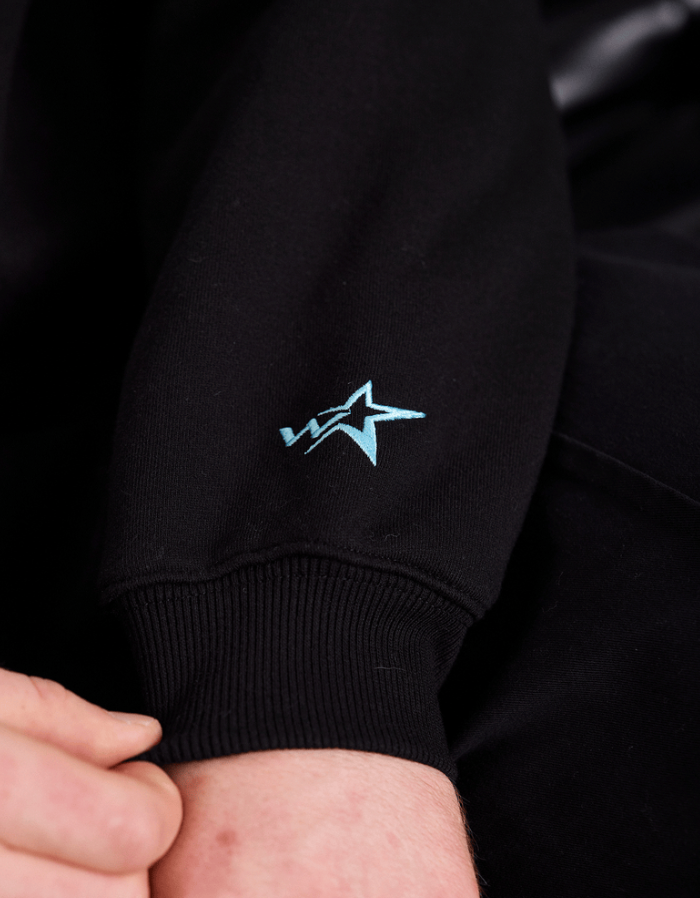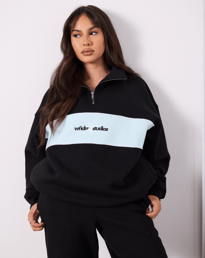 Loose fit; Drop shoulder 410GSM heavy weight brushed fleece Black with blue panelling across the chest Zip up funnel neck Long sleeves; Ribbed cuffs Ribbed hemline Embroidered branding to front & back