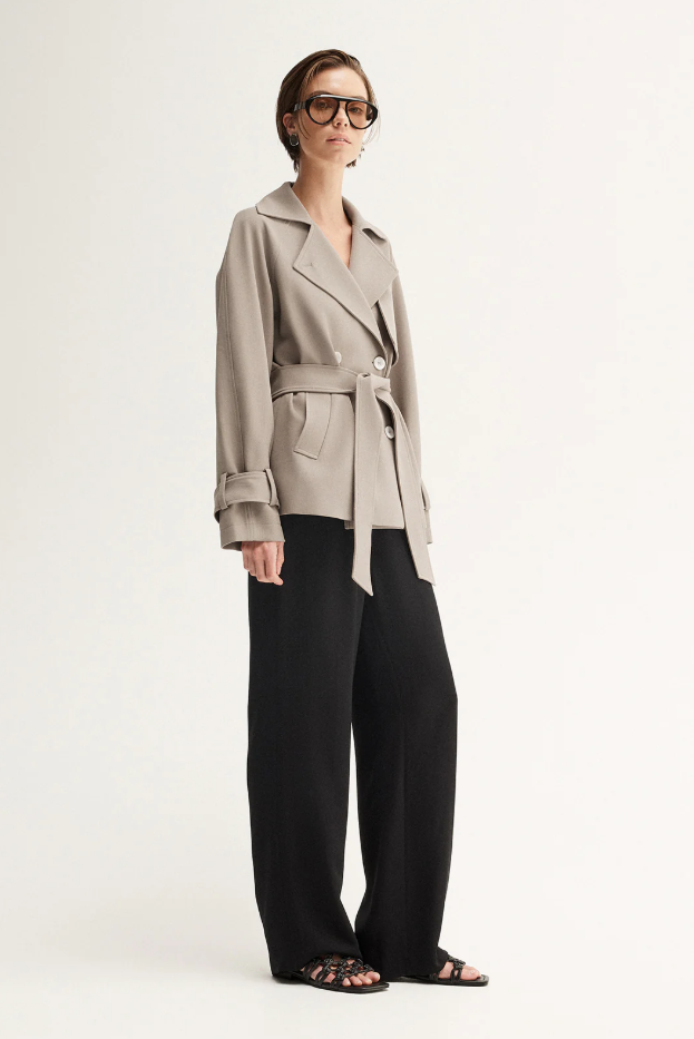 Details Heavyweight fabric Slightly relaxed fit Double breasted Button closure Cropped length Tie belt