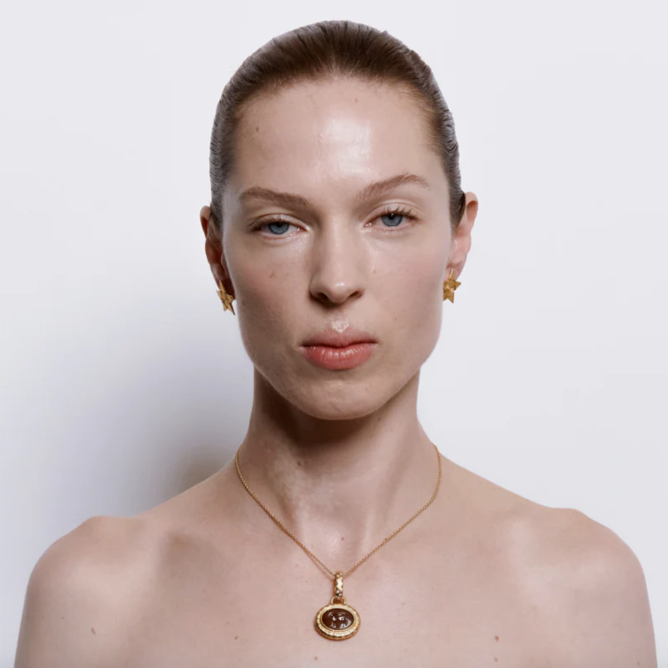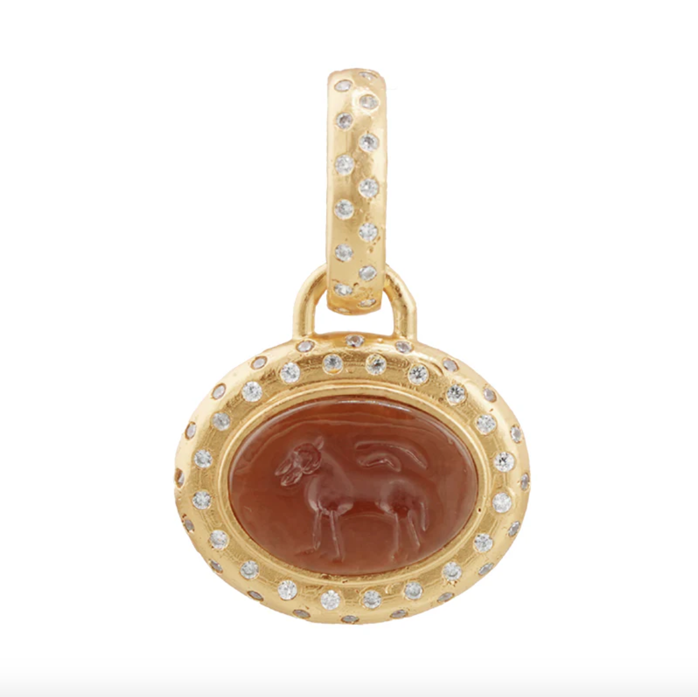 A wine-red resin stone based on Ancient Roman carnelian relics carved with an animal motif, sits east-west in a donut-shaped bezel setting. The gold border, and the pendant’s bail are profusely studded with tiny cubic zirconia gems. Ornate, theatrical, unapologetic. Suits late hours, lush velvet, and entrances made to be remembered.