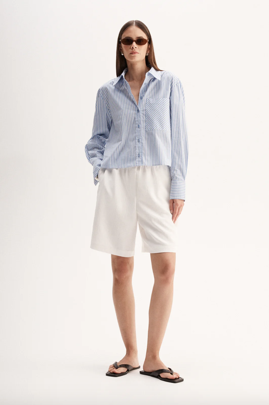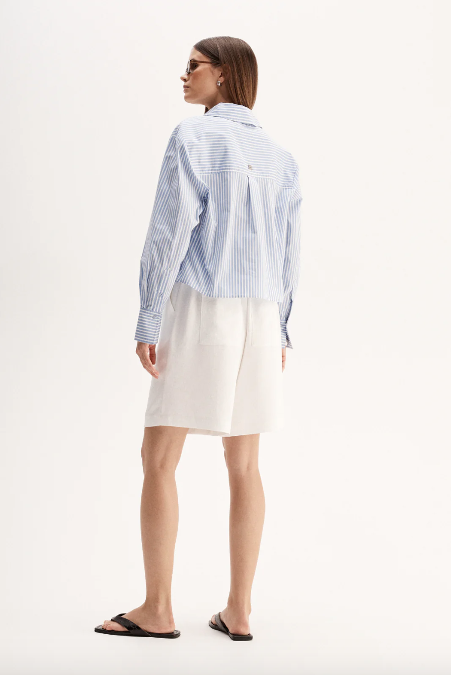 The Dash Stripe Shirt is made of a soft cotton blend with a classic stripe pattern. Cut to our signature relaxed silhouette with a cropped length, this shirt is a seamless addition to your workwear capsule.