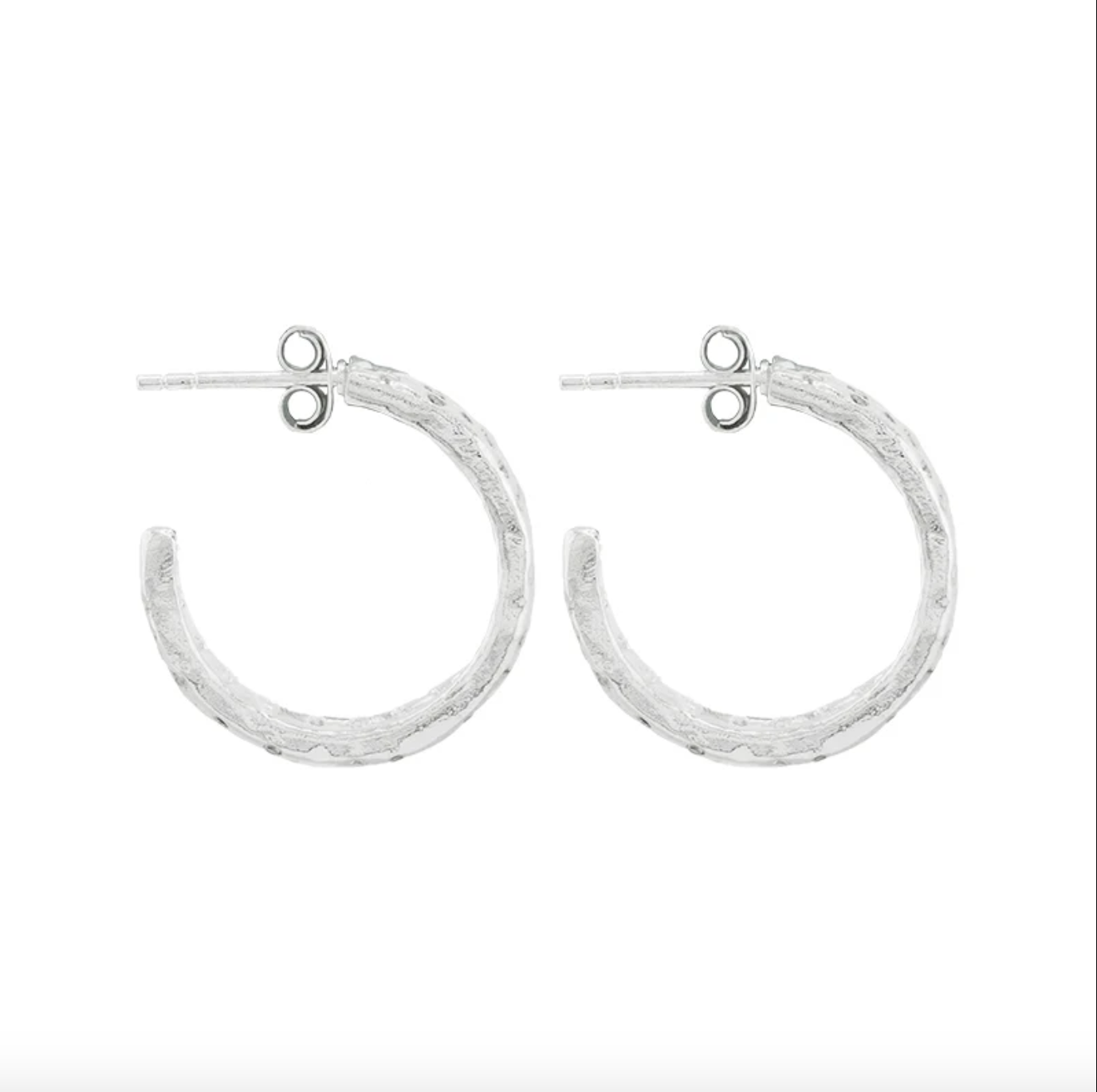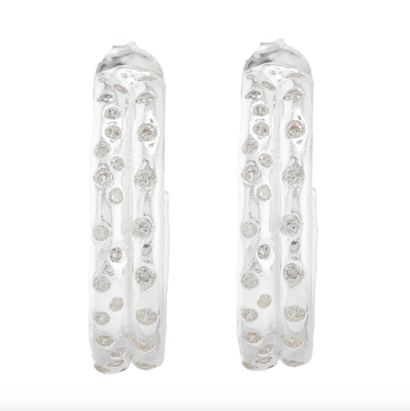 Subtle and minimalist sterling silver half hoops, sculpted with a central ridge that merges two forms into one, are studded with a delicate stardust pavé of cubic zirconia to catch the light from every angle. A hoop earring with a twist, they are eminently stackable, sitting just as well on the ear lobe as higher up on the ear.